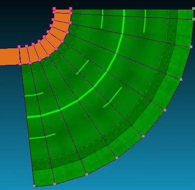 4. Turn Vertex Large on and use the stripface tool to create sidewalks using the points of the sidewalk construction polygons and circles. Extrude the stripface polygons to the proper sidewalk height and delete all polygons created that would not be seen from the road. The sidewalk polygons should go in their own object or set of objects. To texture the sidewalks smoothly, use the stripface tool again to create textured pieces the full length of the road following the outside edges of the sidewalk.