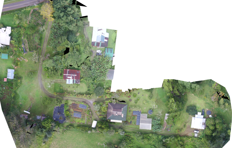 I also attempted to make an orthophoto in 2017. I used the "dronemapper" mobile app to flight-plan and control my DJI Phantom3, gathered 88 images at roughly 3 cm ground resolution. The images were processed into an orthophoto using dronemapper's software-as-service, and also processed using Pix4D's similar service. Below is a snapshot of the ortho as processed by Pix4D. Dronemapper and Pix4D produced similar results for areas of flat ground, but gave very significant distortion/clipping artifacts around obstructions like trees, and curiously, they gave very different artifacts from each other (diferent algorithms). Also, as of 2018, both cost around $1000/year subscription to use the software-as-service, so that puts a damper on the future.
